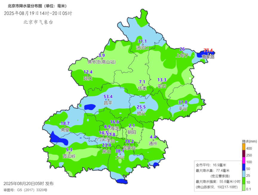 昨天14时开始北京自西向东出现强降雨,19日14时至20日05时全市平均降水量16.9毫米,城区平均13.6毫米,最大降水量为密云曹家路77.4毫米;最大降水强度出现在房山陈家坟,19日17时-18时降水55.8毫米。